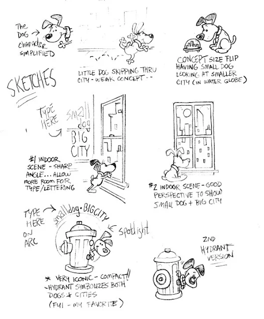 I then sent a page of rough concept sketches showing the simplified dog character doing various things related to cities. She liked the idea of seeing a city outside the window. She favored the version with the side view of the dog - wanting to see his face.
