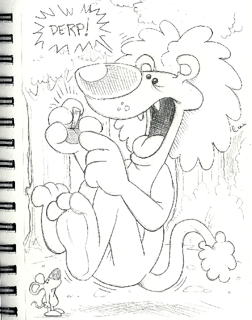 Here's another pencil sketch from one of my sketch books. This one is a nod to the classic fable, The Lion and the Mouse. Of course, I made it more silly . . . usually illustrators do a very realistic image of a real looking lion and mouse. Realistic just ain't my thing . . . while I highly admire those who can create beautiful realistic imagery, I really have not desire to do such images.